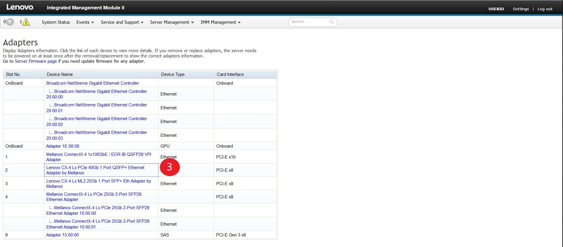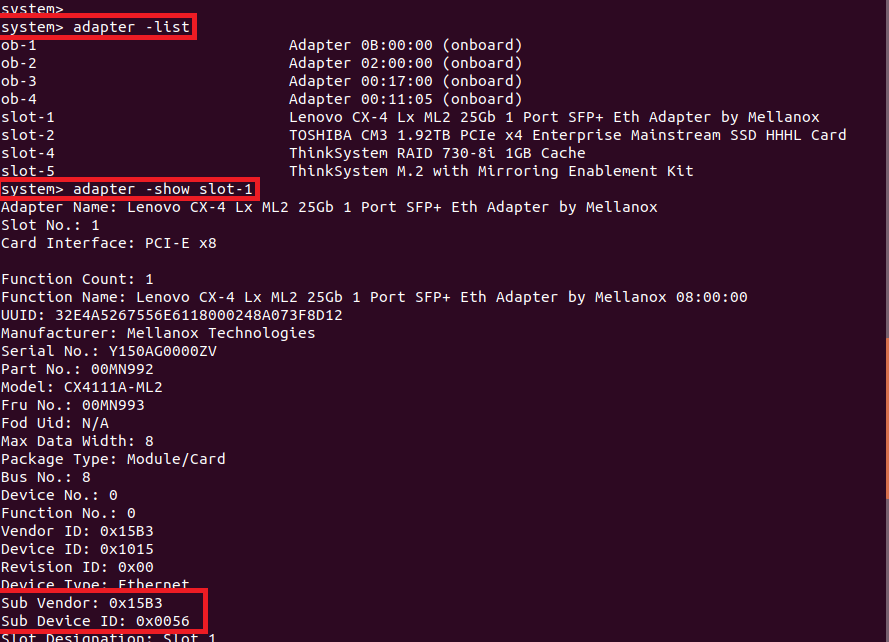 Use SSH client to start BMC CLI session, then use the "adapter" command to query device(s)