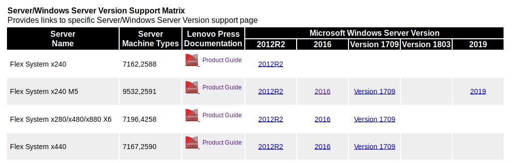 • Selecting a Microsoft Windows Server distro within the table of supported Lenovo Servers/Microsoft Windows Server versions displays a listing of that server's supported devices. Each device will include information/links to available drivers, required device firmware and suggested utilities. In situations where multiple drivers are required, please ensure ALL the drivers are installed to the operating system.