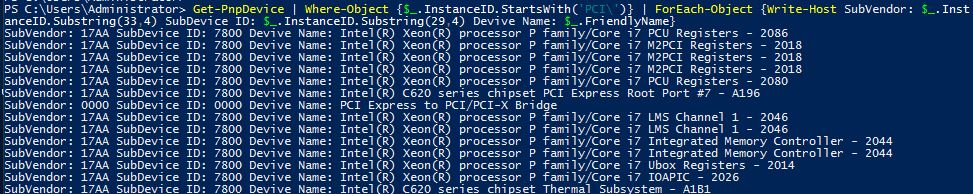 Get-PnpDevice | Where-Object {$_.InstanceID.StartsWith('PCI\')} | ForEach-Object {Write-Host SubVendor: $_.InstanceID.Substring(33,4) SubDevice ID: $_.InstanceID.Substring(29,4) Devive Name: $_.FriendlyName}