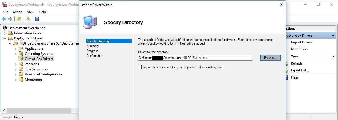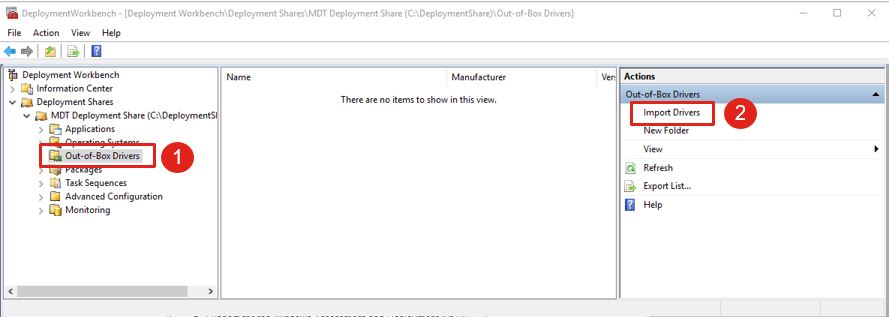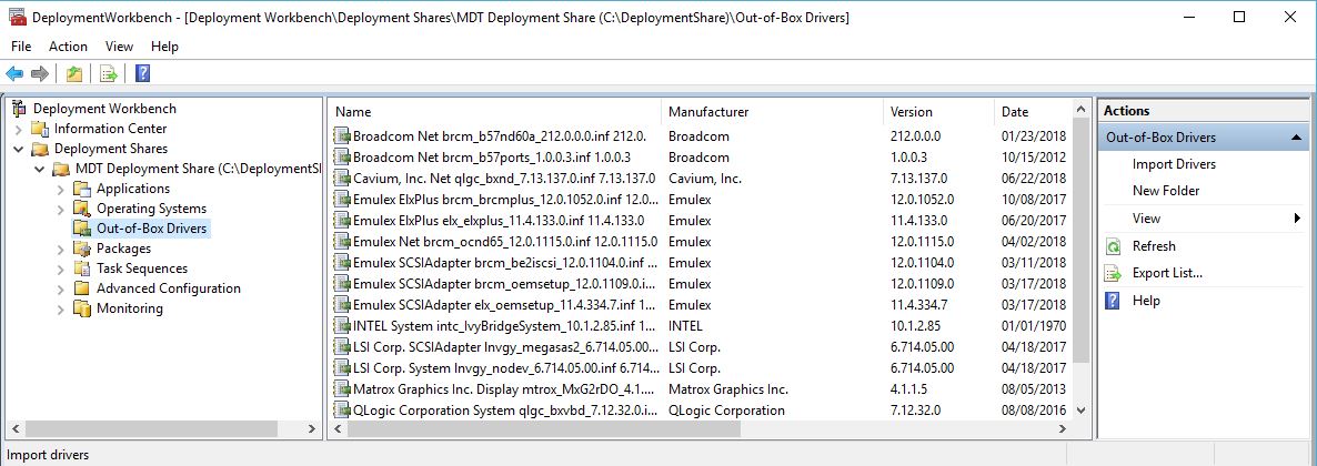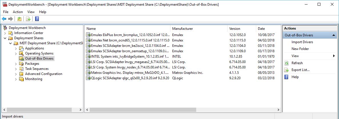 2. Using the Microsoft's Deployment Workbench, after creating a Deployment Share, select Out-of-Box Drivers, then select Import Drivers from Actions menu