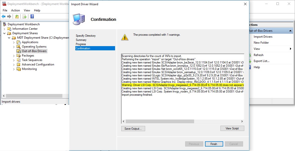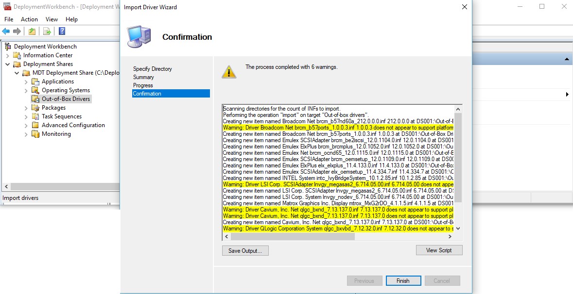 3. Import Driver Wizard will provide confirmation that Out-of-box driver were imported (Warning messages are normal and can be ignored. Device Driver developers often package drivers for multiple versions/architectures (i.e: x86-64 and ia64) of Windows Server in to the same .inf definition, this message indicates that an incompatible driver was included in the bundle).