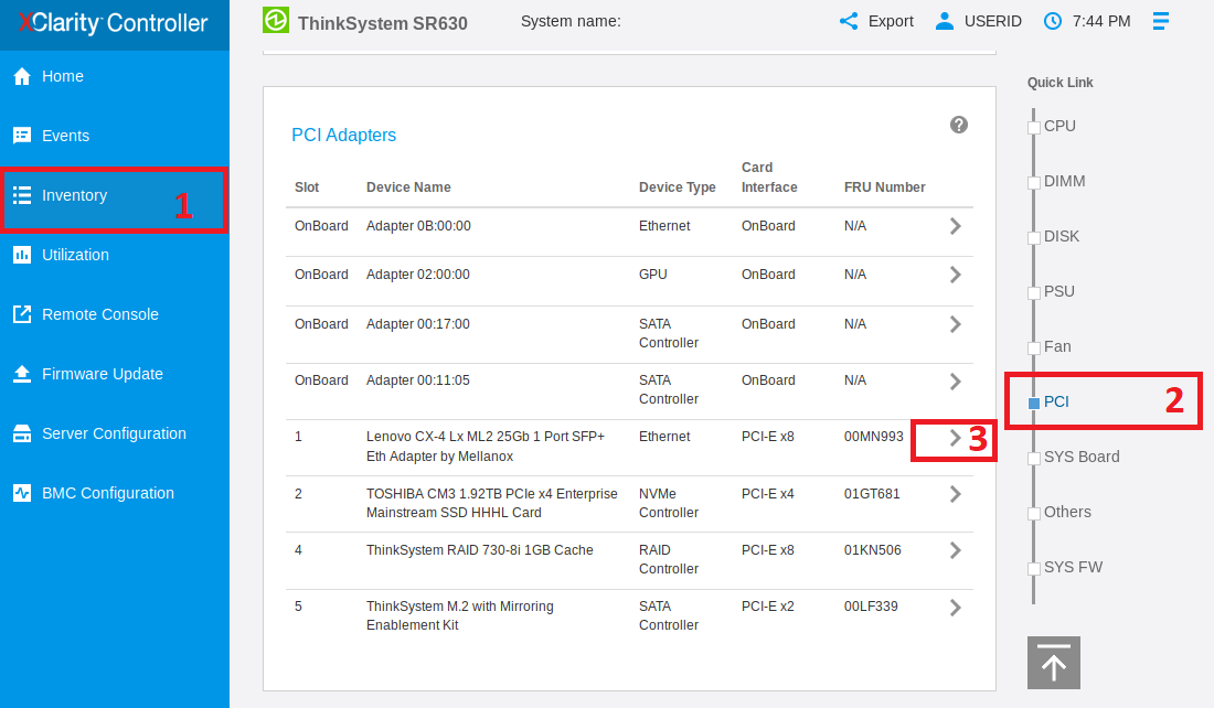 XCC: Select Inventory (1), then PCI Quick Link (2)
